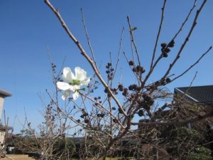 自宅庭の利休梅は春に咲く花なのに、一輪だけ狂い咲き(?)しています。葉は全て落ち冬支度をしている枝ですが、健気に咲いた一輪の白い花は可憐です。