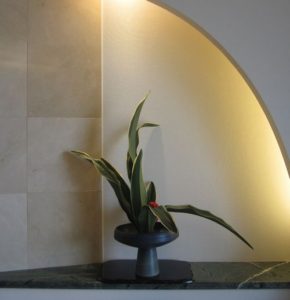 万年青は7種伝の一つで特別な活け方をするので、活け方を覚えるしかありません。これまで長年何回となく活けていますが、今の先生に万年青の活け方を見て頂くのは今回で最後となるので、しみじみと寂しい気持ちになり取り組みました。と言うのも、先生がご高齢のため、活け花教室は私が最後の生徒として幕を下ろされることが、昨年決まっていました。