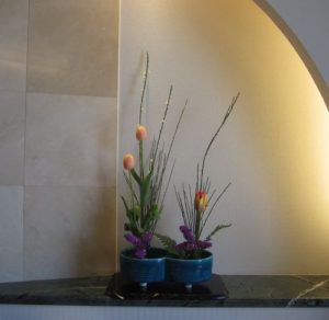 お生花はこれまでに何度も習ったエニシダやツツジの一種活けでしたが、生花新風体では2株活け、自由花はリューカデンドロンやアリウム等これまでの花材と違ったユニークなものが準備してあり、美術館入口の飾り棚も今までと少し趣が違います。