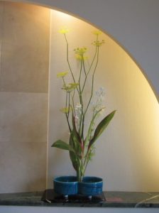今回は、初夏を感じるウイキョウとスプレーデェルフィニウムとドレセラの生花新風体と、それにシマフトイとアンスリウム、カーネーションを使った自由花を活けました。