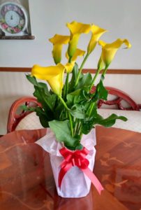 私も今朝は母にプレゼントを渡しました。また、母宛てに美術館ご利用のお客様からは黄色のカラーの鉢植えを頂き、義弟の実家からはカーネーションの切花が届きました。周りを和ませる母のキャラクターは、家族にとっては勿論ですが、お客様方からも愛されていて私も誇らしく思います。