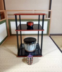 その後、そのまま更好棚を使った薄茶点前です。薄茶のお点前は大体マスターしているので濃茶点前の後は単純に感じるようになりました。
