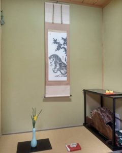 寅年らしく掛け軸は若冲の虎の絵(複製品)が描かれたものが飾ってあり、香合は百人一種の絵柄のものでした。