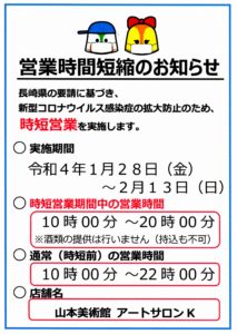 長崎県に「まん延防止等重点措置」が適用され、昨日から県下全域を「まん延防止等重点措置区域」に指定することに伴い、飲食店及び遊興施設に対し営業時間の短縮等が要請されました。