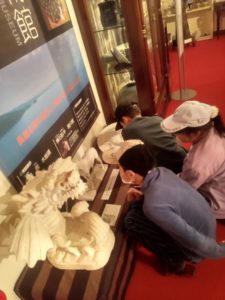これまで、時々は展示室を鑑賞していた甥たちですが、室内の左奥に展示している不動明王の原型像が怖いと言ってはそちら側の作品を見るのは敬遠していました。現在は5年生と少し大きくなったので「もう怖くない!」と言いながら、不動明王像や他の彫刻原型像なども熱心に見ています。そして、浮世絵作品には特に興味を示し、姉の小学5年生の甥が一枚の作品を指差して「あーっ、神奈川沖浪裏(復刻版)だ~」と、北斎の富嶽三十六景の有名作品のタイトルを間違うことなく言うので、嬉しくなりました。3人は子供ならではの目線で作品の不思議に思うところを私に聞いたり、作品に描かれているポーズを真似したりとゆっくり美術鑑賞を楽しみました。
