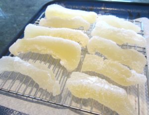 そして今月に入って、母が諫早市内の果物直売所で晩白柚が売ってあったと、欲張って小ぶりなものですが10個以上も仕入れてきて、「またざぼん漬けを作ってね」と言います。一度に作れるのは2個~3個分くらいで、雨の日が続くと乾かすのに時間がかかり、きちんと仕上げるまでには4~5日要します。出来上がったら次を作り、それが完成したらまた次を作りと繰り返しながら現在4回目を行っています。新しい物が出来上がる頃には前に作った物は食べたり人に差し上げたりして無くなっているので作業的にはちょうど良い間隔ですが、同じことが何回も続くと作るのもまた食べるのも少し飽きてきました。