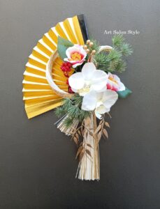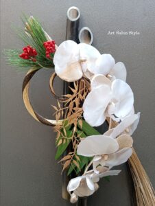 今年も新作を作製しましたので、いくつかご紹介します。まず、大きなしめ縄に大輪の芍薬と梅の花の豪華な作品(写真左)、次に扇と水引を土台にして胡蝶蘭と椿を飾った明るい作品(写真中央)、三点目は黒竹に銀色の胡蝶蘭と黒金の水引のシックな作品(写真右)で、いずれにも不老長寿の縁起物と言われる松に南天を添えています。