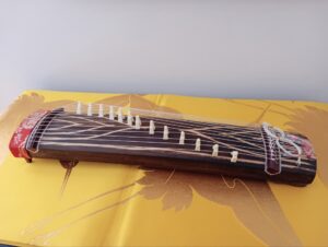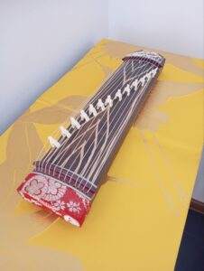 しっかりした作りで弾けるようにもなっていて、非常に良い音が出ます。サロンの螺鈿の棚に、お気に入りの鶴の柄の黄色い帯を敷いて飾りました。