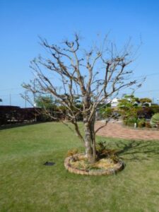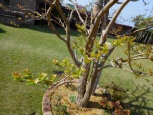 昨年9月の台風により根が半分ほど浮き上がり、親戚筋の同級生がトラクターを使って元の状態に引き起こしてくれたサルスベリの木が、柔らかな新緑の葉を噴き出してきています。