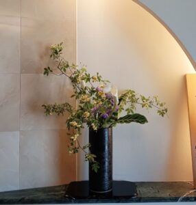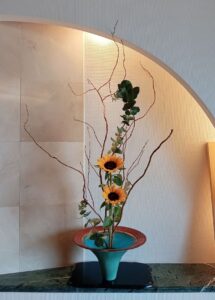 急に気温が上がって春なのか初夏なのか分からないような天候ですが、向日葵は真夏のイメージがあるので先取りも先取りです。雲龍柳とユーカリの三種活けにしましたが、柳が面白い形状だったのでバランスが取れて良い形に出来上がりました。