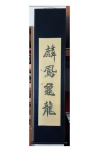 以前には、「佛眼」(ぶつげん)の書をいただきましたが、今回の作品は「麟凰亀龍」(りんぽうきりゅう)で、「麟」「鳳」「亀」「龍」はそれぞれ麒麟、鳳凰、玄武、青龍を意味すると説明があり、黒色を基調として軸装してあります。