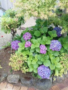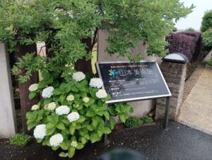 自宅玄関の入口には薄紫色のダンスパーティー、和室前の小庭にはコンペイトウと紫色のヤマアジサイ、美術館入口のアーチの小看板横には白色のヤマアジサイがあります。