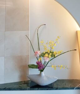 昨日の池坊華道のお稽古では、トクサとカーネーション、黄色のオンシジュームに赤紫のハマナデシコ、モンステラの葉の自由花を活けました。