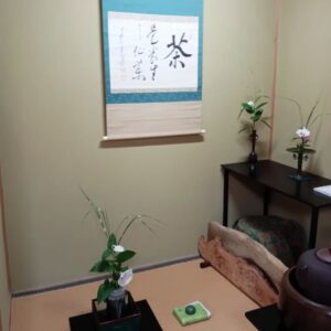 茶箱点前は箱の中に道具類を全部仕舞い込み持ち運ぶので、野点でもできる点前です。また、日ごろあまり稽古することがなく使うこともないお点前で動作を完璧に覚えることは難しいです。が、先生から茶箱点前の6種類全伝を網羅した教本をいただいたので、自主練に励んでいます。(N)
