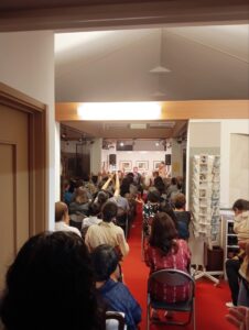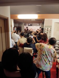 ライブの一部は三線と太鼓で沖縄民謡を披露、二部ではギターも加わり沖縄ポップスの演奏がありました。沖縄の音楽は独創性に溢れ楽しく愉快で、自ずと体がリズムに乗って動き出している方たちの姿が多くみられました。それに、口笛の上手なお客様が”ピュー、ピュー″と鳴らす合いの手の音色がますます会場内を盛り上げてくれて、フィナーレの曲では皆さん立ち上がり一体となって手を上げて踊り、楽しみ、熱い(暑い?)熱気に包まれたライブとなりました。