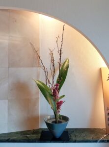 先日の華道のお稽古では、黄色い実を付けた山査子(サンザシ)と葉蘭とピンク色のケイトウで生花新風体を活けました。