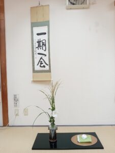 私の茶道の先生などが今回の講座の担当で、私に急遽、水屋(裏方)をお願いしたいと連絡がありました。そういうことで、会場に到着すると「一期一会」の掛物やたくさんの茶花が飾られ、既に茶席も出来上がっていました。