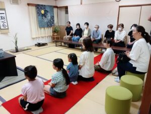 講座申し込みの小学生の子供から大人まで15名全員が席に着いたところで、オカリナで「赤とんぼ」など秋の童謡の演奏があり茶会が始まりました。