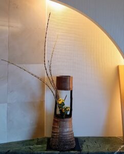 一年ぶりに二重切り花器に柳と小菊の古典花を活けました。
