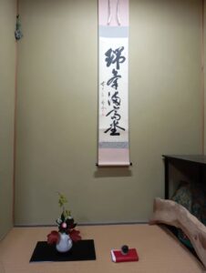 お客様に近い場所に釜を配置した冬季のお点前「炉」にお茶室が変わり、床の間には昨年の炉開きでも掛けてあった「瑞気満高堂(ずいきこうどうにみつる)」の掛物と、秋から冬にかけての季節感のある茶花が飾ってありました。