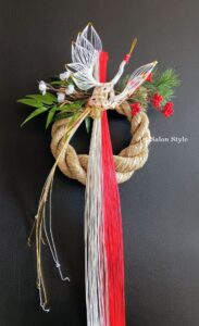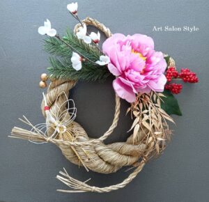藁を編んだしめ縄にアーティフィシャルフラワーのお花や松に南天、水引細工の鶴などで装飾したしめ飾りなども作っています。