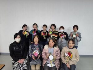 約1時間半で全員の作製が終わり、それぞれ完成した作品を手に持ち記念撮影をした後片付けを行い、帰る際には会で販売している「恋みかん」というミカンジュースをお土産に頂きました。
