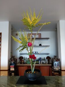 生花新風体では花材として初めて扱う柊南天とバラとニューサイランを使いました。柊南天は南天の実の形状のように黄色の花が咲き、それを取り囲むように棘のあるヒイラギの葉が生えている木です。