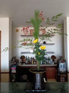 今年のお正月花は、御玄猪に若松と南天と菊を活けて、サイズが大きいのでサロンカウンターの中央に飾りました。
