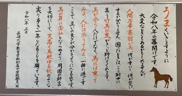 今年の干支「午年」に因み、姉が「馬」の入ることわざや言葉を入れて考えた全生徒たちへのメッセージを模造紙に手書きし、勤務している中学校の廊下掲示板に張り出したと写メを見せてくれました。