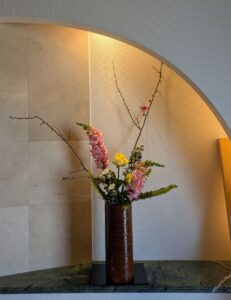 今月後半の活け花の稽古では、ボケにバラ、ストックと小菊にシダの投げ入れと、雪柳に黄金ヒバ、チューリップの生花新風体を行いました。寒い日が続いていますが、活け花では彩り明るく春が一足先にやってきたようです。