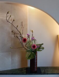 木蓮を活け花の花材に使うのは初めてで、木は独特の曲がった形をしており枝にタメ(カーブを付けること)を効かせようとすると簡単にポキッと折れてしまうので、曲げたい部分にはワイヤーを巻いて形を作り、ピンクのガーベラと紫のスターチス、レースフラワーにモンステラで豪華な活け花に仕上げました。
