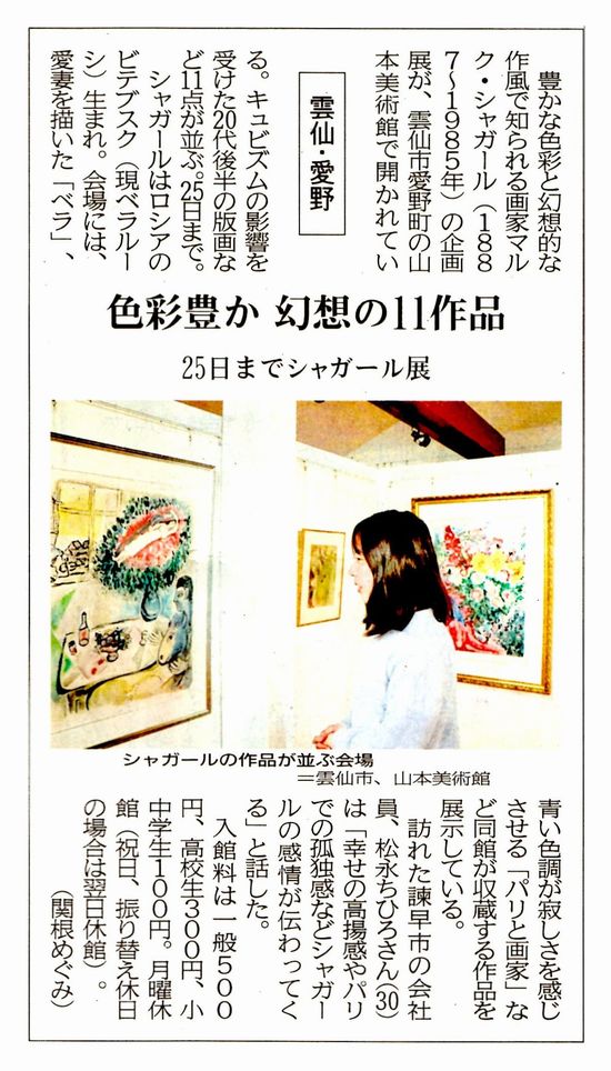 長崎新聞に「愛と平和の画家 マルク・シャガール展」開催中の紹介記事が掲載されました。