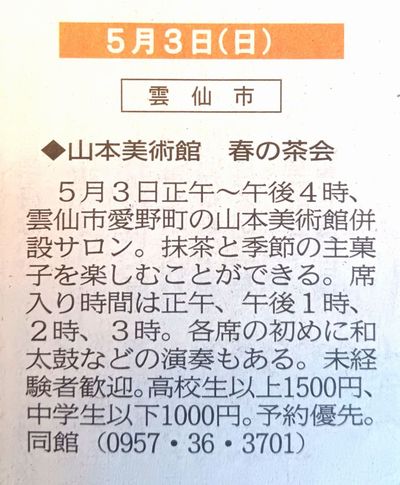 長崎新聞の「週末お出かけ情報」欄に、山本美術館「春の茶会」の案内掲載がありました。